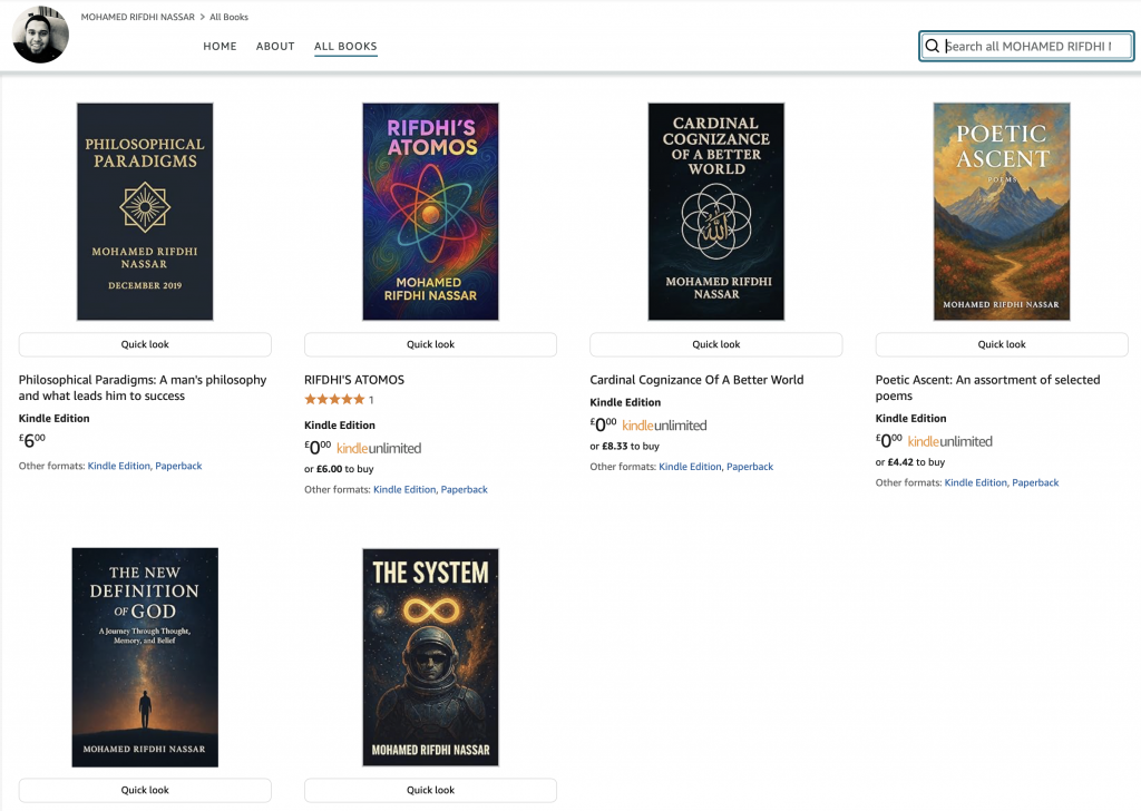 Mohamed Rifdhi Nassar has published several works available on Amazon, covering philosophical, spiritual, and poetic themes. Notable titles include: